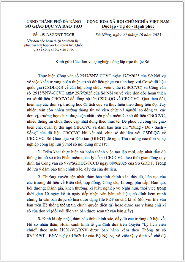 Thực hiện Công văn số 2547/SNV-CCVC ngày 17/9/2025 của Sở Nội vụ về việc khẩn trương hoàn thiện cơ sở dữ liệu phục vụ tích hợp với Cơ sở dữ liệu quốc gia (CSDLQG) về cán bộ, công chức, viên chức (CBCCVC) và Công văn số 2913/SNV-CCVC ngày 29/9/2025 của Sở Nội vụ về việc đôn đốc hoàn thiện cơ sở dữ liệu CBCCVC để đồng bộ lên CSDLQG về CBCCVC;