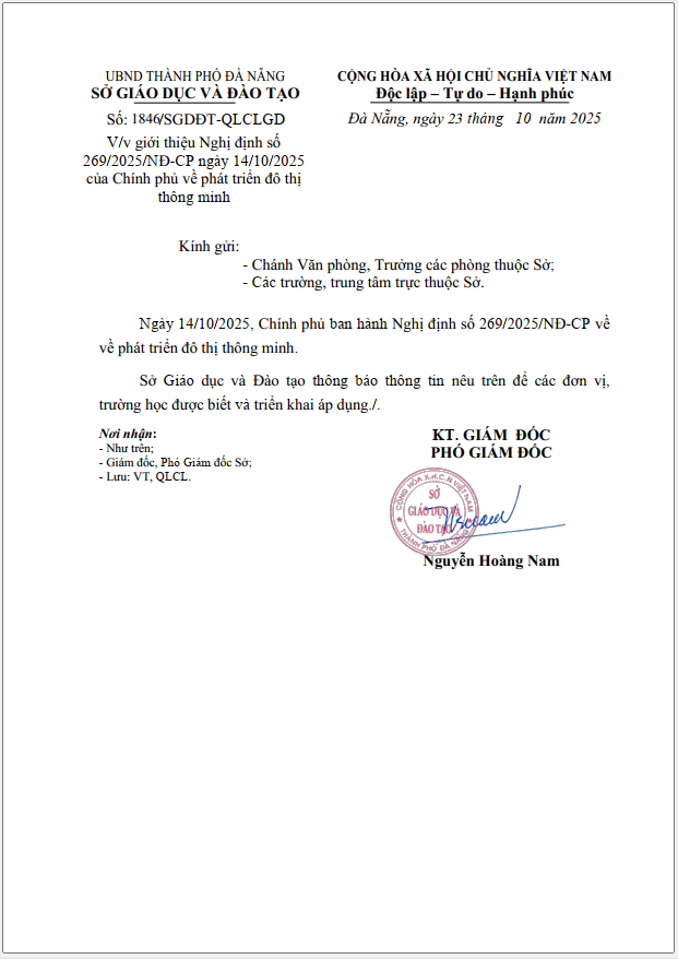 Sở Giáo dục và Đào tạo ban hành văn bản số 1846/ SGDĐT-QLCLGD về việc giới thiệu Nghị định số269/2025/NĐ-CP ngày 14/10/2025 của Chính phủ về phát triển đô thị thông minh.
