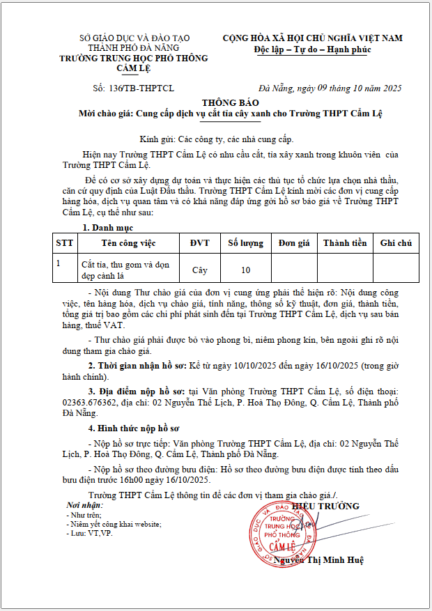 Hiện nay Trường THPT Cẩm Lệ có nhu cầu cắt, tỉa xây xanh trong khuôn viên của Trường THPT Cẩm Lệ.