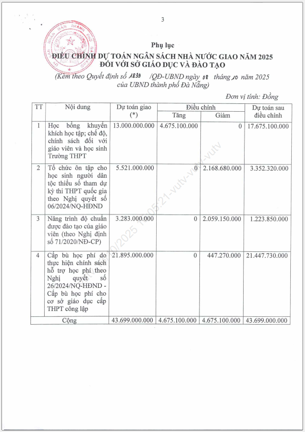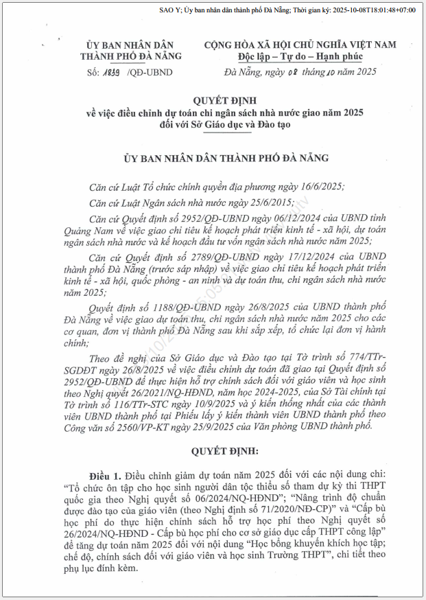 Căn cứ các Luật và Quyết định cấp trên, Ủy ban nhân dân thành phố Đà Nẵng ban hành quyết định số 1839/QĐ-UBND về việc điều chỉnh dự toán chi ngân sách nhà nước giao năm 2025 đối với Sở Giáo dục và Đào tạo.