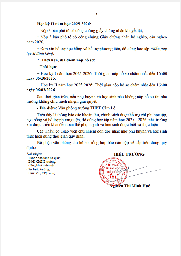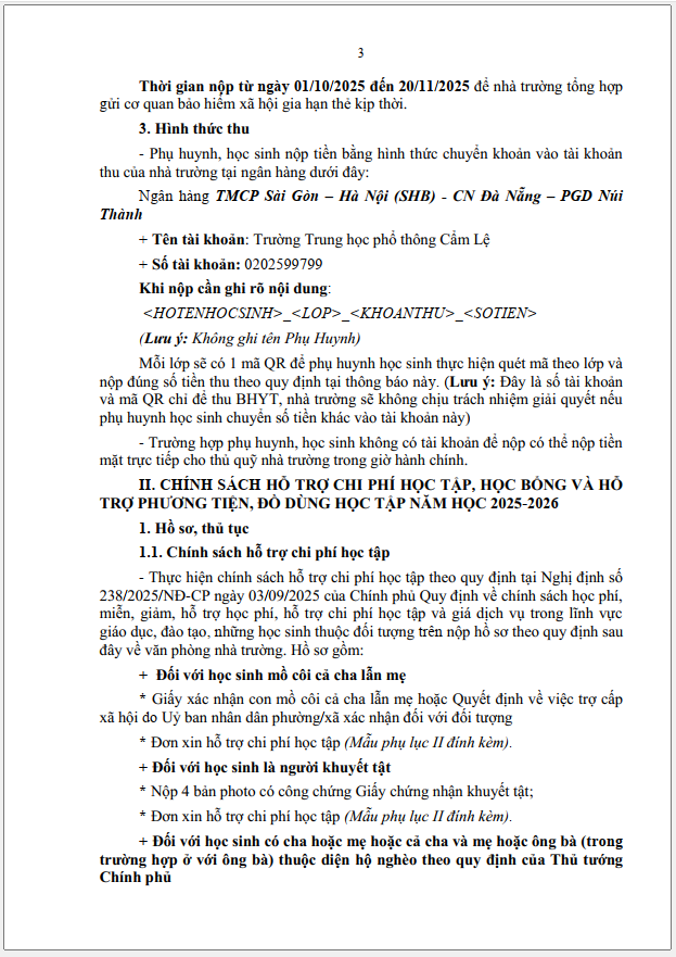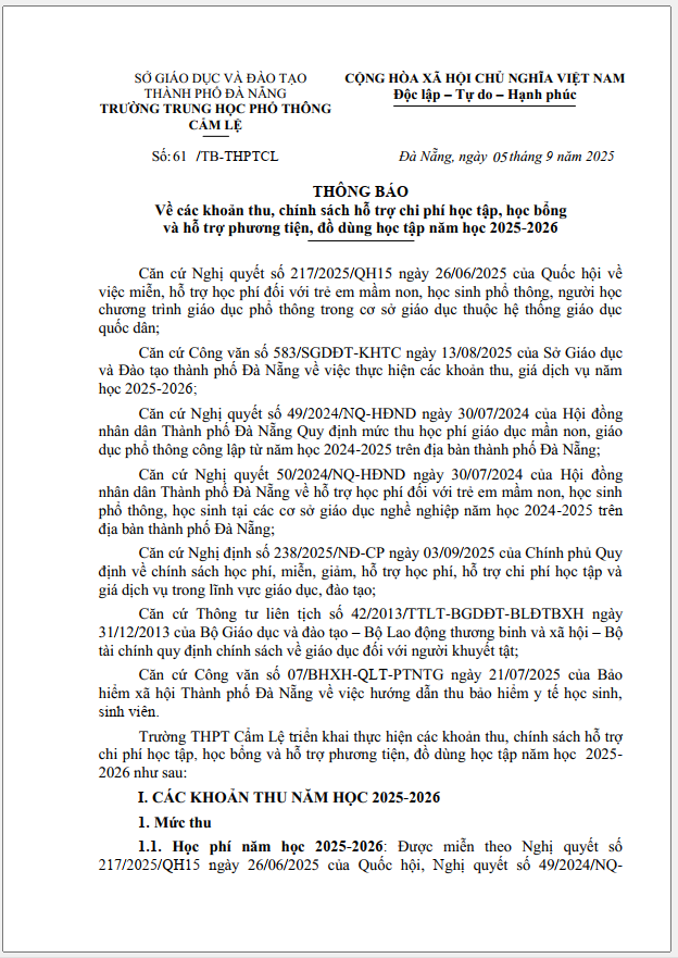 Trường THPT Cẩm Lệ thông báo đến quý phụ huynh và học sinh về các khoản thu, cùng các chính sách hỗ trợ trong năm học 2025-2026 như sau:
