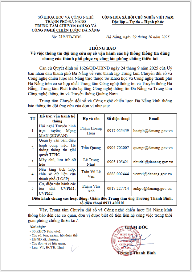 THÔNG BÁO VỀ VIỆC THÔNG TIN ĐỘI ỨNG CỨU SỰ CỐ VẬN HÀNH CÁC HỆ THỐNG THÔNG TIN DÙNG CHUNG CỦA THÀNH PHỐ PHỤC VỤ CÔNG TÁC PHÒNG CHỐNG THIÊN TAI