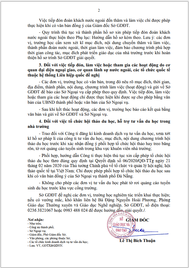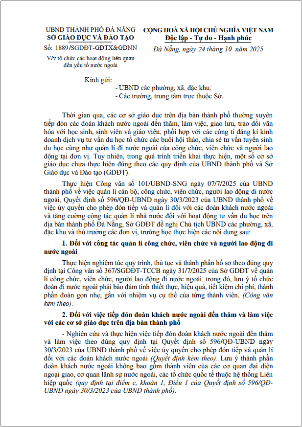 Thực hiện Công văn số 101/UBND-SNG ngày 07/7/2025 của UBND thành phố về việc quản lí cán bộ, công chức, viên chức, người lao động đi nước ngoài, Quyết định số 596/QĐ-UBND ngày 30/3/2023 của UBND thành phố về việc ủy quyền cho phép đón tiếp và quản lí đối với các đoàn khách nước ngoài và tăng cường công tác quản lí nhà nước đối với hoạt động tư vấn du học trên địa bàn thành phố Đà Nẵng, Sở GDĐT đề nghị Chủ tịch UBND các phường, xã, đặc khu và thủ trưởng các đơn vị, trường học thực hiện các nội dung theo công văn 1889/SGDĐT-GDTX&GDNN ban hành.