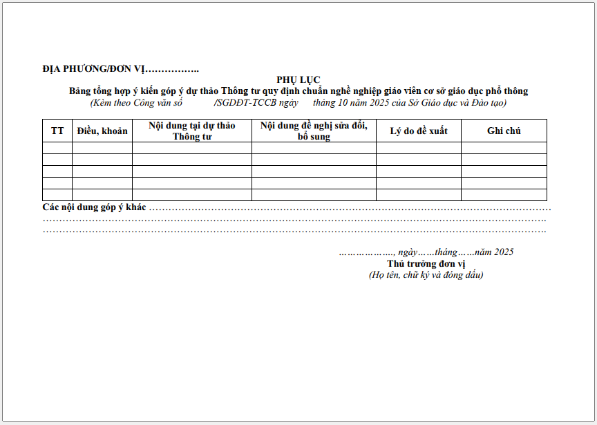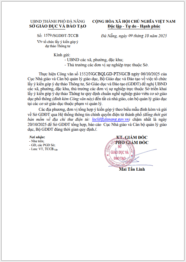 Thực hiện Công văn số 1552/NGCBQLGD-PTNGCB ngày 06/10/2025 của Cục Nhà giáo và Cán bộ quản lý giáo dục, Bộ Giáo dục và Đào tạo về việc tổ chức lấy ý kiến góp ý dự thảo Thông tư, Sở Giáo dục và Đào tạo (GDĐT) đề nghị UBND các xã, phường, đặc khu, thủ trưởng các đơn vị sự nghiệp trực thuộc Sở triển khai lấy ý kiến góp ý dự thảo Thông tư quy định chuẩn nghề nghiệp giáo viên cơ sở giáo dục phổ thông (đính kèm Công văn này) đến tất cả nhà giáo, cán bộ quản lý giáo dục tại các cơ sở giáo dục thuộc phạm vi quản lý.