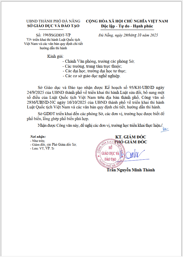 Sở Giáo dục và Đào tạo nhận được Kế hoạch số 95/KH-UBND ngày 24/9/2025 của UBND thành phố về triển khai thi hành Luật sửa đổi, bổ sung một số điều của Luật Quốc tịch Việt Nam trên địa bàn thành phố, Công văn số 2936/UBND-NC ngày 16/10/2025 của UBND thành phố về triển khai thi hành Luật Quốc tịch Việt Nam và các văn bản quy định chi tiết, hướng dẫn thi hành.