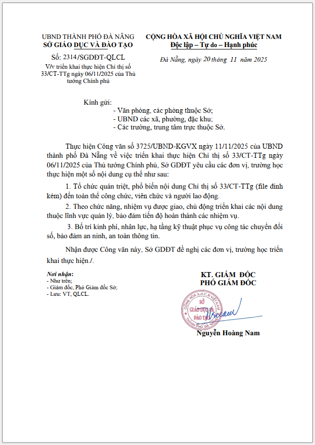 Thực hiện Công văn số 3725/UBND-KGVX ngày 11/11/2025 của UBND thành phố Đà Nẵng về việc triển khai thực hiện Chỉ thị số 33/CT-TTg ngày 06/11/2025 của Thủ tướng Chính phủ, Sở GDĐT yêu cầu các đơn vị, trường học thực hiện một số nội dung cụ thể (theo file văn bản đính kèm)